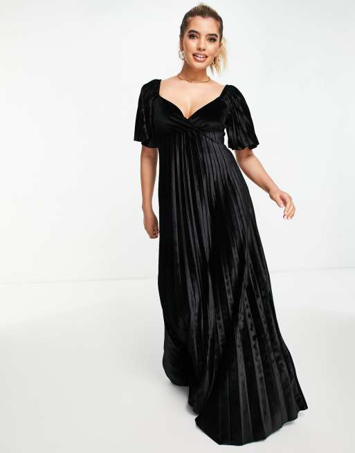 Asos Design Twist Back Pleated Empire Waist Velvet Maxi Dress In Black Asos